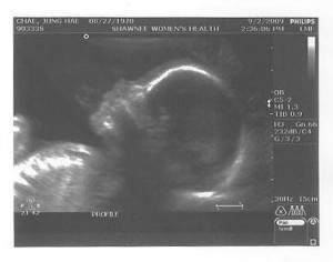 Yesterday Jung, the mother of our child-to-be, sent me by email two sonogram images from her most recent visit to the Shawnee Women’s Health Center in Carbondale, Illinois, where she has gone to obtain her master’s degree in poetry. Two small, grainy, blurry, black and white images, one showing a pair of tiny arms with even tinier hands, the other a very round head with distinct features—a nose, mouth, eyes, ear, the works (we both concur that these features are patently Italian, and that pasta dishes will be the order for the day for years to come).