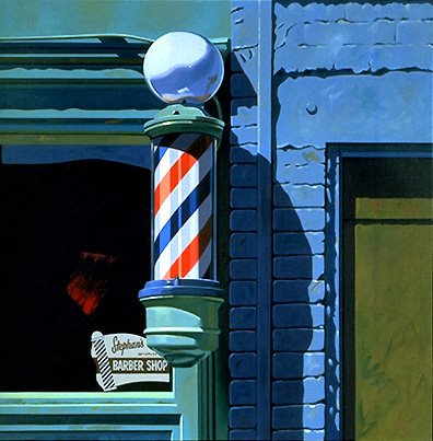 Ahead of me down the block a barber’s pole swirls, blending red blood, blue skies, and white surrender, drawing me to it like a ship in a stormy sea to a lighthouse. I stand before the plate glass watching the barber at work, a man no older than me, but with hair is gray, and so he’ll do. Maybe it’s nostalgia, or I’m just getting old, but for some some reason today I long to sit in one of those big white complicated chairs with flat filigreed iron plates for the souls of my shoes and with a phalanx of colored bottles lined up before a cracked mirror mended with masking tape.