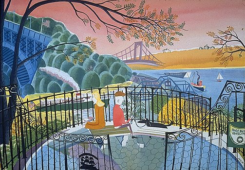 Mine is a neighborhood full of parks, but my favorite by far is the one that everyone who lives around here calls the Overlook, short for Half Moon Overlook, Half Moon having been the name of the ship Mr. Hudson (whose statue stands atop a high column in another park) came here on. As parks go it must be one of the smallest, a sixteenth of an acre, if that, shaped (intentionally? ironically? accidentally?) yes, like a half-moon, with room scarcely for one long curved wooden bench—another crescent. The overlook occupies a strategic point overlooking where the two rivers—the Harlem (Spuyten Duyvil Creek, technically) and the Hudson—meet. From it one has a view of the swing bridge connecting Manhattan to parts north, and of the Palisades clear down to the George Washington Bridge, the New Jersey-side tower of which is just visible to the right of the mound of trees that is Inwood Hill Park, Manhattan.