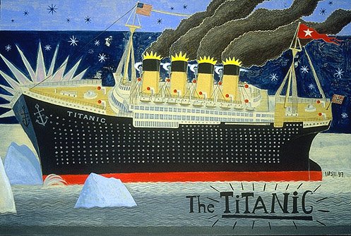 The painting in the antique shop was about four-feet wide and a foot and a half tall, with a cheap gold-painted plaster frame. My then-wife and I had just bought our first apartment on the Upper West Side. The apartment featured a sunken living room with a dining alcove above it. We painted one wall of the alcove bright red, and docked our most extravagant and expensive furniture item there: a 1920’s maple English bar unit, with a hinged top that opened to a Busby-Berkley display of blinding light and mirrors etched with droll cocktail shakers and martini glasses. The painting, I thought, would look splendid over it. It was not a realistic depiction. All the details were somehow, spectacularly wrong. The funnels were much too tall and wide, the iceberg a monumental exaggeration, the colors impossible. It was a child’s dream of the Titanic sinking, a work of unfettered naiveté. It reminded me of the sketches I had done in grade school. The antiques dealer wanted $800 for it, too rich by far for my blood, so I let it go.