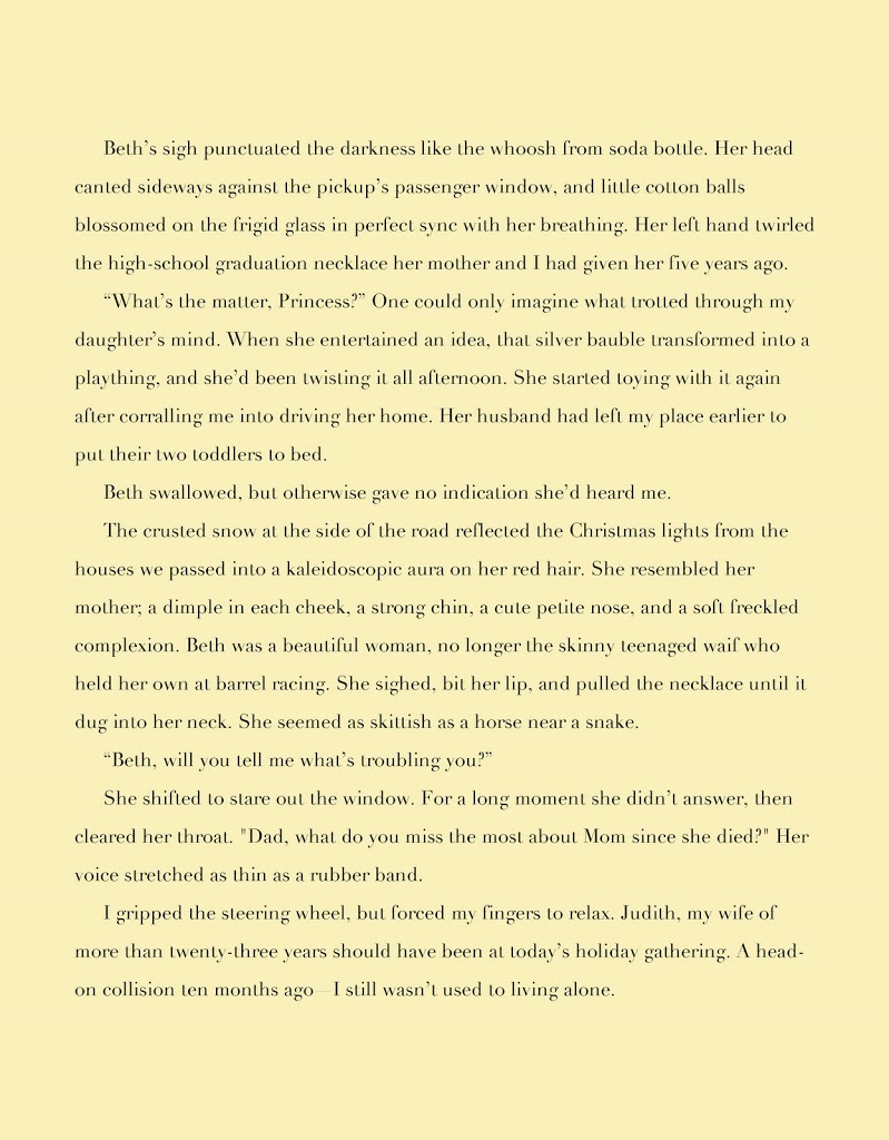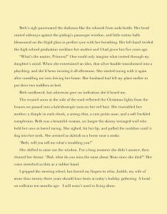 The passing scenery adds something; the snow and the Christmas lights give us the season and ground the situation in a solid setting. On the other hand, Beth’s description feels forced. From the narrator father’s point-of-view in the shifting darkness of his truck, he might note the play of lights on her hair, and see the neckless digging into her neck. But “Beth was a beautiful woman, no longer the skinny teenaged waif who held her own at barrel racing” is intrusive, more the words of Beth’s anxious author than of her concerned, driving father.