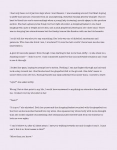 I found the opening line exciting in that it immediately puts the spotlight on two issues that combined could be very controversial. A relationship with a criminal. As you get farther into the page I found it hard to believe that this trance like state that the woman was in lasted longer then 20 seconds. The ending of the first page also pulled me in due to the the man so easily accepting the woman assuming he was someone else. Although this was good, the last line, “More than you know” seemed a little contrived.