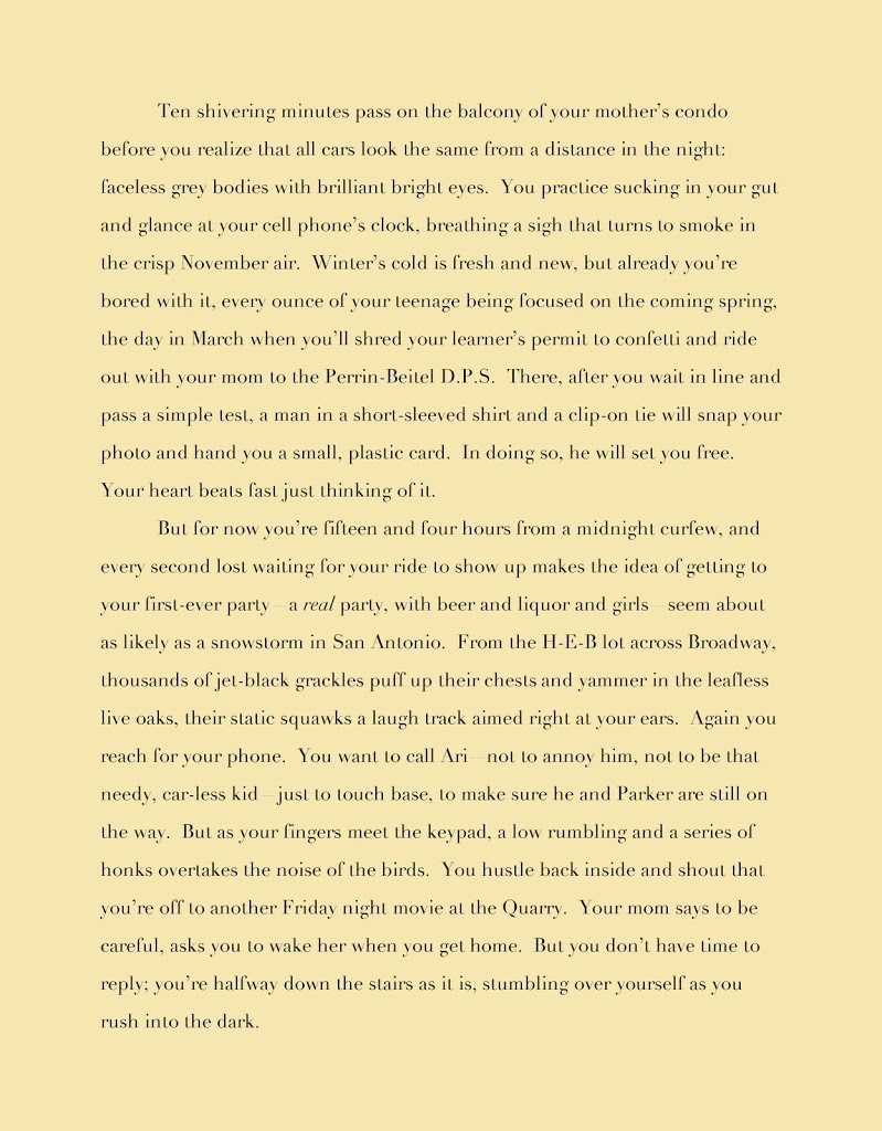 In the given example “you” (a teenage boy) wait on the balcony of your parents’ home to be picked-up by some friends for your “first-ever party.” Just thinking of it “your heart beats fast,” for you know it’s not just a party that awaits you at the far end of that ride: it’s a right of passage, an initiation. There will be “beer and liquor and girls.” You almost can’t believe it. It even seems to you, as you stand there waiting, that the likelihood of your actually achieving this milestone is about as great as that of “a snowstorm in San Antonio.”